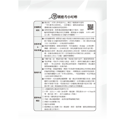 鶴立團隊參酌坊間學測考生經驗,統整成「學測應考小叮嚀」,其中詳列了考前必須事先準備的「功課」,包括:詳讀大考中心的應考規則、查看考場及考前準備時必須注意之處、臨場作答時必須留意的事項、考試必備物品確認等內容,一次性條列整理,讓同學不再惶惶無措!