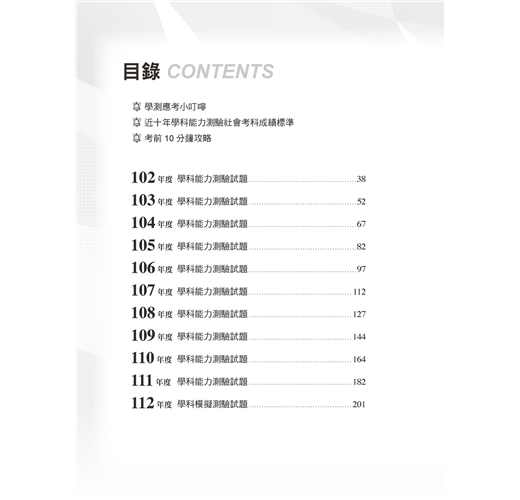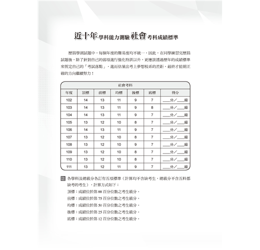 本書於各年度的標題上標註「五標落點」與「考試時間」,不僅透過「考試時間」加強考試的臨場感,令同學習慣答題的步調與節奏,更提供當年度的「五標級分」與「原始分數」供同學參酌對照,以求進行更精準的自我檢測,補強弱點,增強優勢!