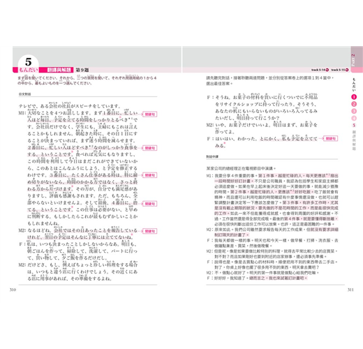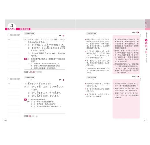 本書模擬考題皆附日中對照翻譯,任何不懂的地方一秒就懂,而藉由兩種語言對照閱讀,可一舉數得,增加您的理解力及翻譯力,詳細題解。此外,本書還會為您分析該題的破解小技巧,並了解如何攻略重點,對症下藥,快速解題。100%有效的重點式攻擊,立馬K.O聽力怪獸!