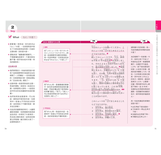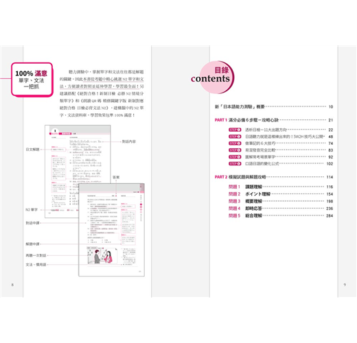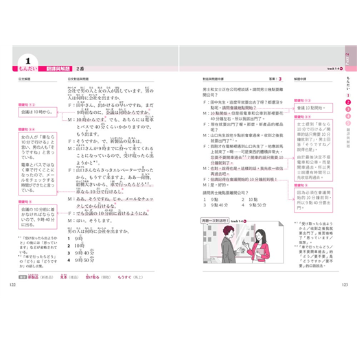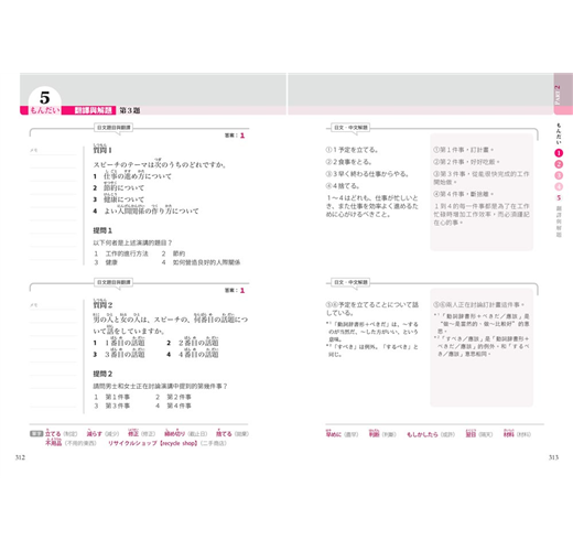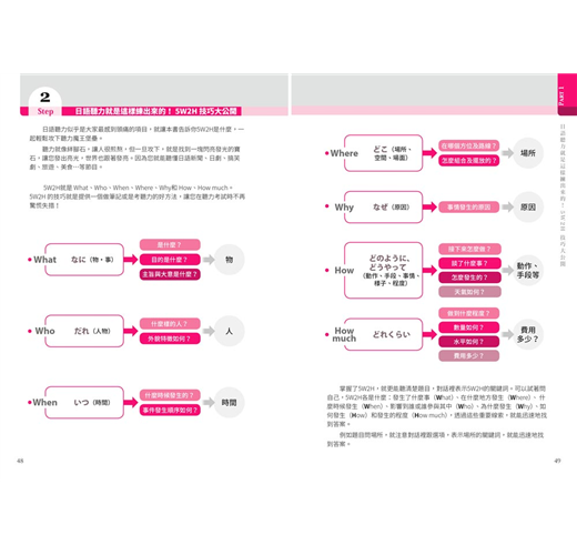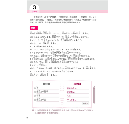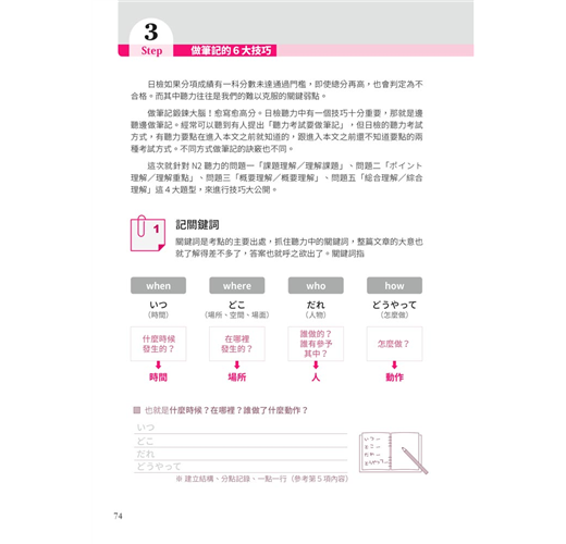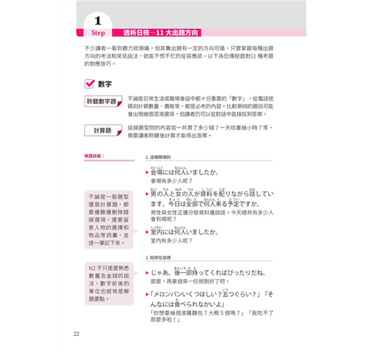 了解出題方向後,循序漸進幫您清楚明瞭的歸類成5W2H,並舉出實際例題,告訴您實際的解題步驟和常見出題陷阱。透過演練及應用,不但能讓您對日檢的考法有更清晰的概念,還能事先歸納出解題的技巧、步驟。正式面對聽力考試時,也能不慌不忙、全心投入、一步步化解難題。