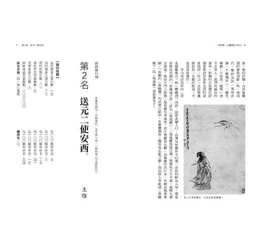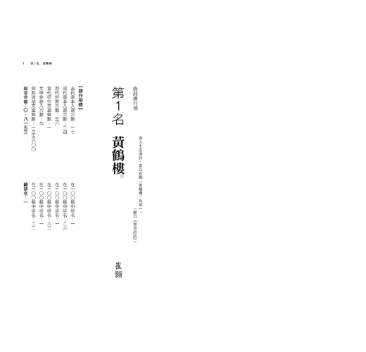 從一個全新的角度,以統計方法從古代選本入選次數、現代選本入選次數、歷代評點次數、當代研究文章篇數、文學史錄入次數、網路鏈接文章篇數,對唐詩進行計算,得出排行榜前100名的唐詩。