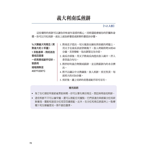 ●這份煎餅不只可以當早餐,還可以搭配任何餐點。它們很適合與綠葉沙拉或新鮮番茄、羅勒和菠菜沙拉或莎莎醬搭配。此外,在沙拉和南瓜表面淋上一點檸檬汁和生蜂蜜是另一項不錯的選擇。