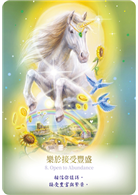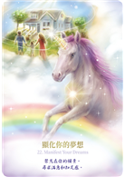 當我握住《魔法獨角獸療癒卡》,看著牌卡裡獨角獸純潔生動的表情、充滿智慧的靈性眼睛、純淨明亮的光角、充滿愛的心輪和飛馬強壯溫暖的翅膀,強烈的喜悅、幸福、平靜、自由、光明、希望的能量進入我的心中並擴散到全身,將我帶進了七次元純淨白光的獨角獸王國。