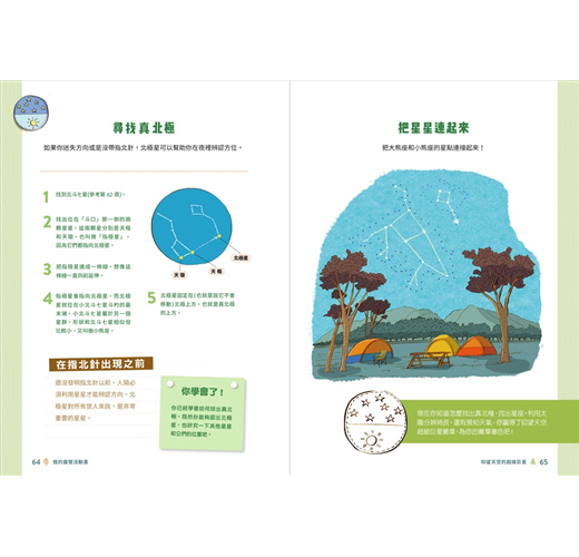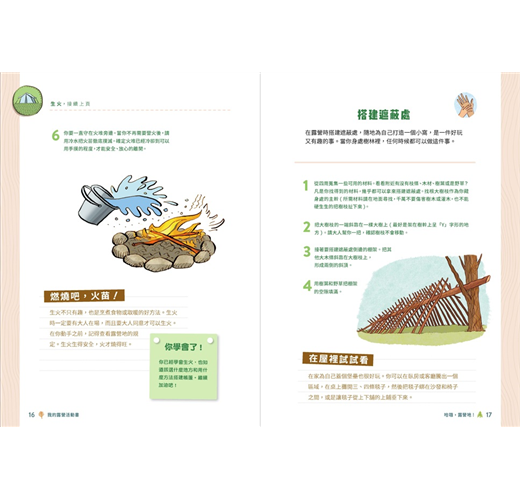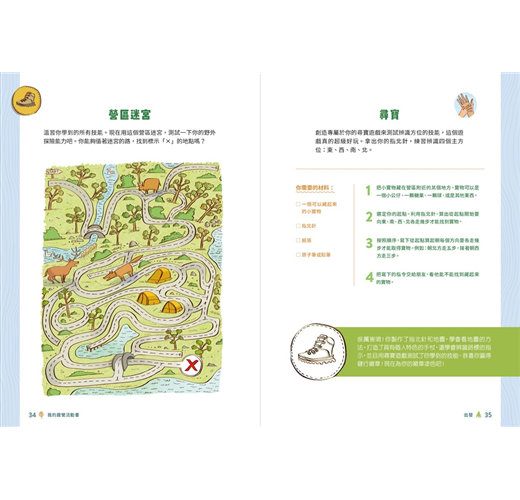 面對野外求生的各種挑戰,你將學會搭建遮蔽處、製作指北針,還有學習如何打繩結等等技能。你也能發揮創意,設計獨家的尋寶遊戲、製作登山杖,並且自己動手做日晷。有些活動會需要大人幫忙,不過大多數的活動都可以自己完成。你可以將這本露營活動書放進背包,下次到野外探險時,就能輕輕鬆鬆的帶著它出發囉!