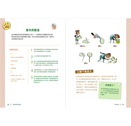 準備好,一起到大自然裡探險吧!到野外露營或健行的時候,你可以觀察到好多現象,也有很多事情可以做──就算只是在自家庭院露營,也一樣樂趣十足。打開書頁探索周遭的世界,學習重要的野地技能,書裡形形色色的活動點子,一定會點燃你對大自然的熱情,讓野外生活好玩得不得了!