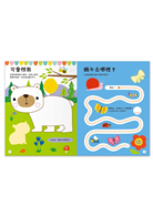 貼貼紙:每頁皆有設計黏貼處,有超多圖案豐富又可愛的貼紙,訓練孩子透過觀察形狀的變化,將貼紙貼上,並且在貼貼紙的過程,訓練孩子使用手指。