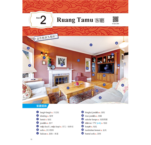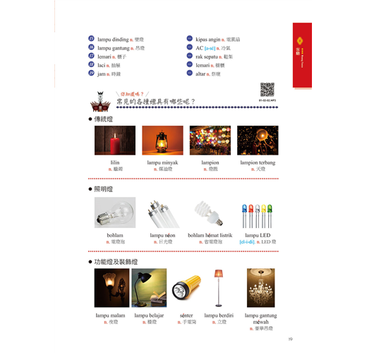 圖解設計,要如何最詳細?例如:一開始一定會學過燈的單字是「lampu」,可延伸出了解路燈是「lampu jalan」,那進一步再把燈細分成「夜燈、吊燈、立燈、手電筒」等等,目前的學習,你分得出來嗎?傳統的學習讓你好像學了很多,但生活中會用到的單字卻總是零零落落,這個不知道、那個不清楚。但是本書在類似的單元中,以上述為例,對照的中文自當不在話下,其燈類單字多會以加入圖片以供讀者一看便知。全圖解另有其他的好處,例如:印尼語單字翻成中文之後,有些詞難免有落差,但是坊間的單字書,礙於版面或是因文化背景的不同而難以解說,往往都把字義縮減成最簡單的字面解釋。但不知道單字的差異性就隨便亂用,只會打壞你想要用印尼語表達的美意,因為你說出來的印尼語只會讓印尼人聽了一頭霧水!而全圖解的學習可以清楚避免這種窘境。