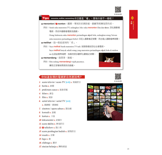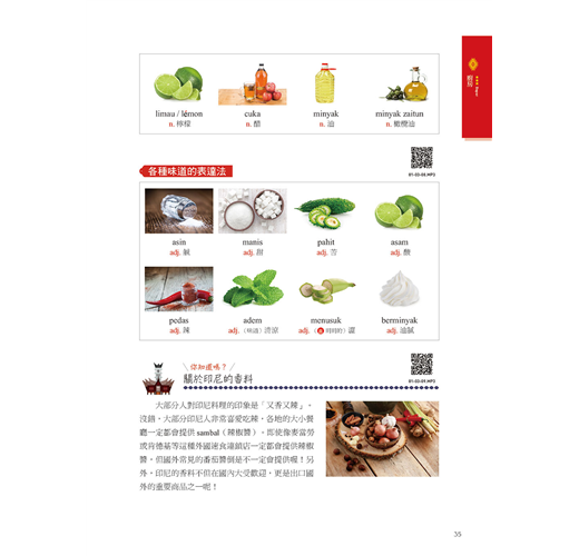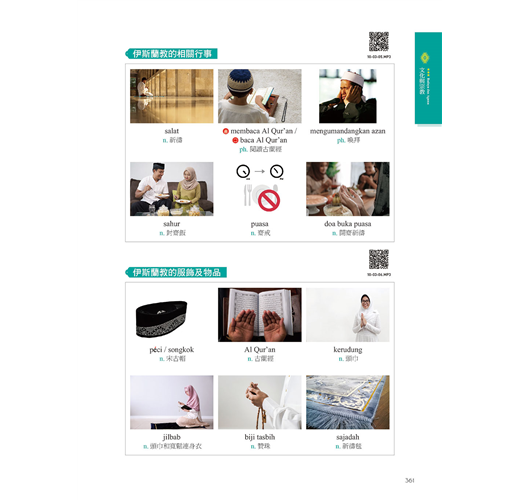 雖然印尼語有「看到拼字就能唸」的特性,但學習者難免擔心自己發音不正確、音調不道地。書中的音檔由母語人士錄製,搭配書中的單字一起唸,可以很準確地學好單字的唸法。音檔以QR 碼方式提供,可隨書中內容掃描聆聽,快速地讓音檔與內容互相搭配。亦提供可一次下載全書 MP3的 QR 碼,不需註冊會員,或額外安裝自己不熟悉的播放 APP,省去每次聽音檔都要掃描的麻煩!(註:打包下載檔案為ZIP壓縮檔,請先安裝解壓縮程式或APP再行下載,由於iOS系統對檔案下載的限制,iPhone用戶需升級至iOS 13以上,方可使用全書完整打包下載連結。)