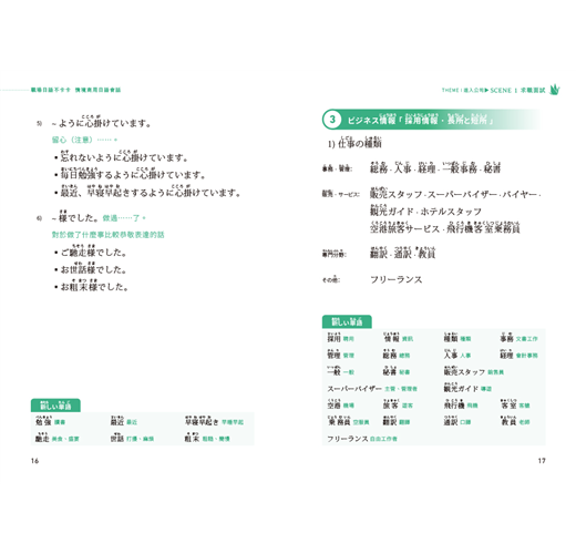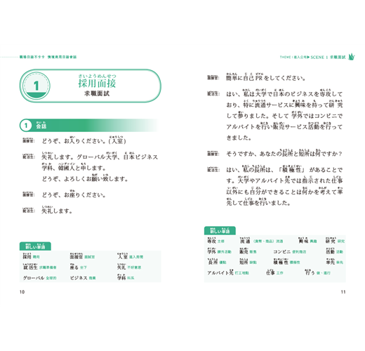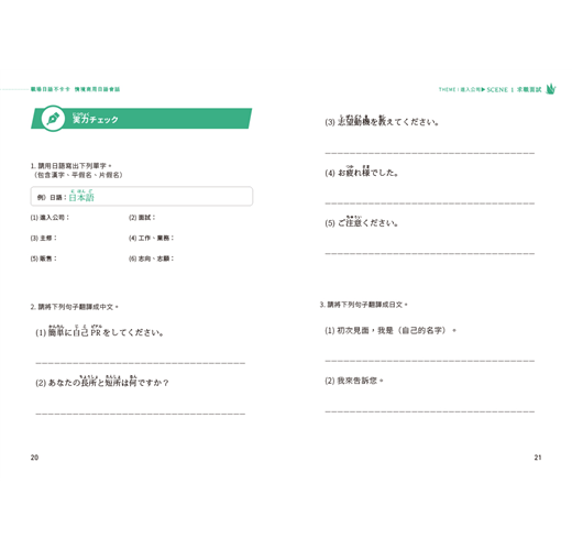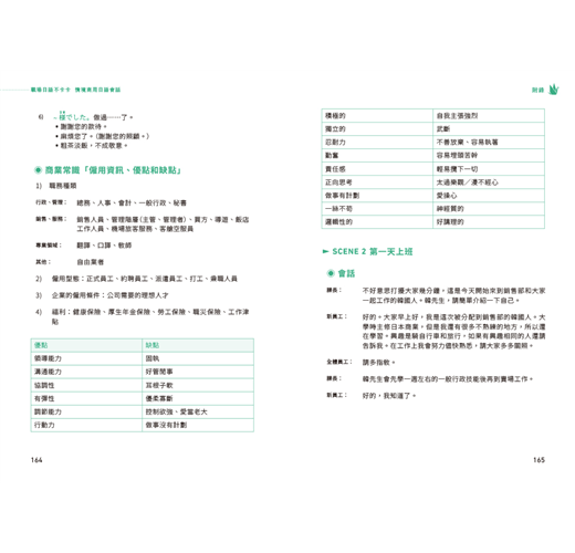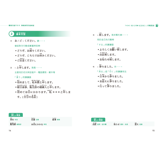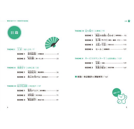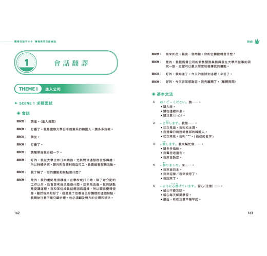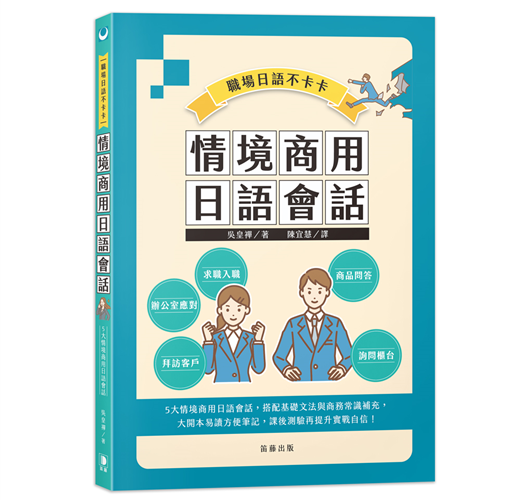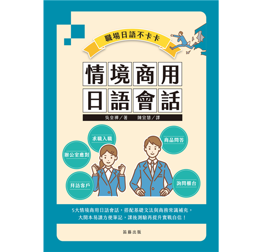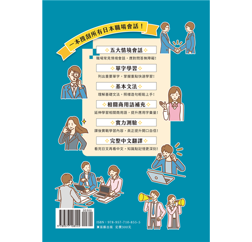 本書收錄求職入職、辦公室應對、拜訪客戶、商品問答、詢問櫃台5大情境會話,日文在前、中文在後,先讀一遍日文與單字解釋,猜猜看中文意思,不清楚的再看附錄翻譯、加深印象,熟讀後便可大大增加開口的自信。