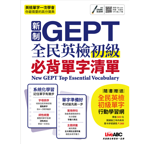 本書收錄財團法人語言訓練測驗中心所公布的初級參考字彙2,263字,並規劃為字母篇和主題篇。每篇的單字均附有KK音標、詞性、中文解釋、英文例句以及中譯。針對不同詞性的同一單字,我們統一條列,讓讀者群組記憶更方便,也能比較不同詞性之間的用法差異。