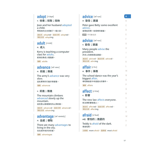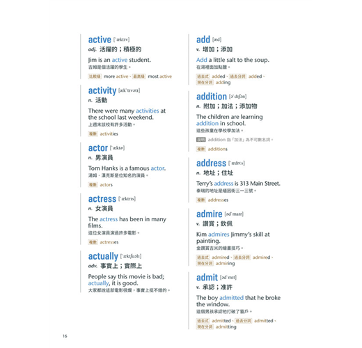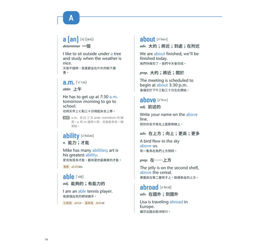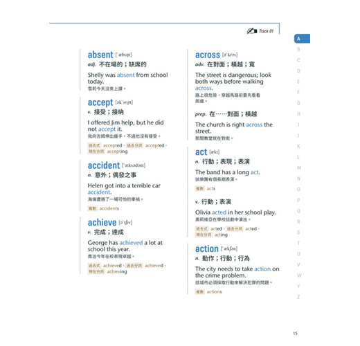此外,名詞、動詞以及形容詞的字彙在運用上會有一些文法通則,例如名詞複數形、動詞三態變化,或是形容詞和副詞的比較級與最高級變化等。每個單字的字形變化皆詳列於單字下方,讓讀者能同時加強文法觀念。本書亦補充字彙使用情境的說明,並介紹相關片語的用法,讓讀者增進單字的應用學習。