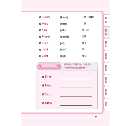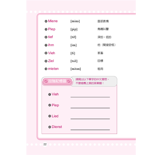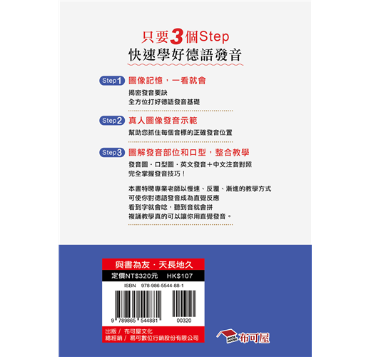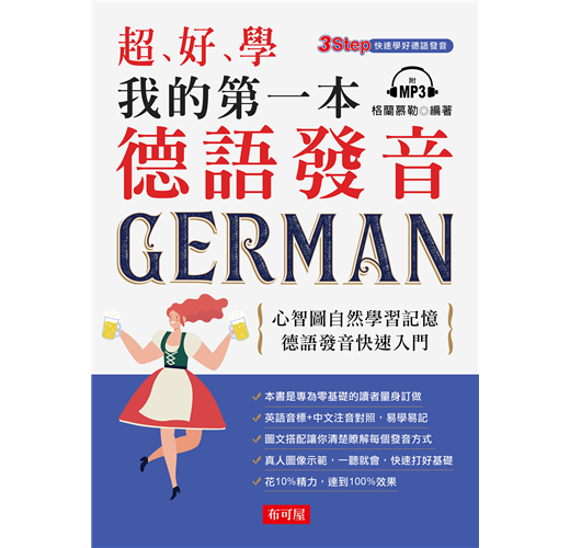 本書系統性的介紹德語發音的各個音素,文字敘述淺顯易懂,還有豐富的嘴形照片,以及發音的口形圖,圖文搭配可以讓你清楚瞭解每個發音方式。此外,每個發音都有豐富的範例單字,可以從單字中,練習發音的方式,還有測驗題目檢測自己的學習效果。