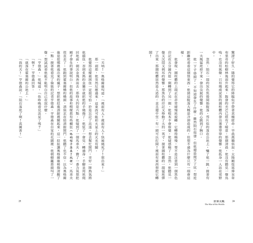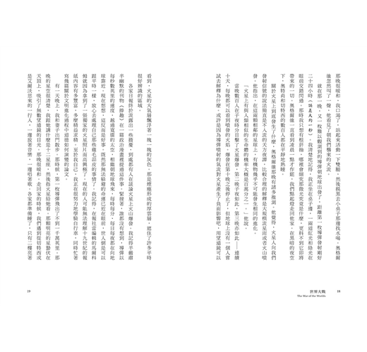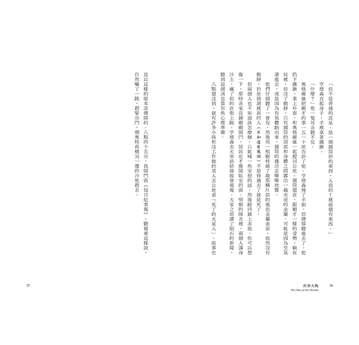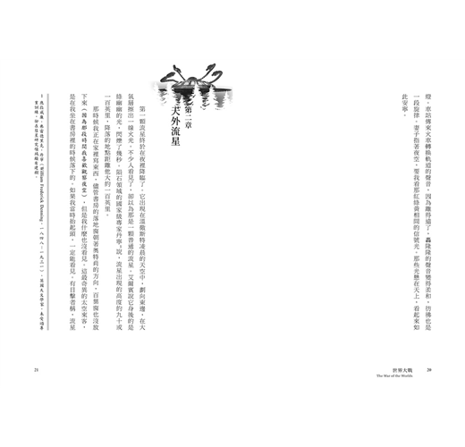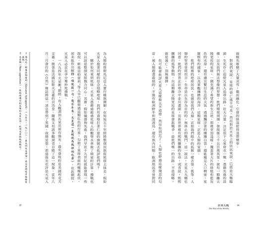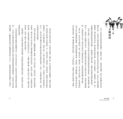 在十九世紀行將結束的那幾年,就算有人說,一種並非神靈、卻比人類擁有更高智慧的生命,正密切注視著這個世界,觀察為各自利害而忙碌的人類,正好比人類用顯微鏡窺視一滴水裡來來往往、朝生暮死的微生物,也沒有人會相信。人類偏安一隅,為了永遠難以填滿的欲壑東奔西跑——顯微鏡下的微生物,大概也在做著同樣的事情吧。
