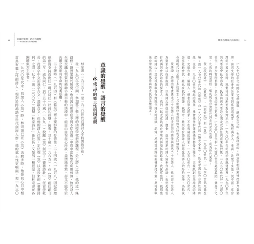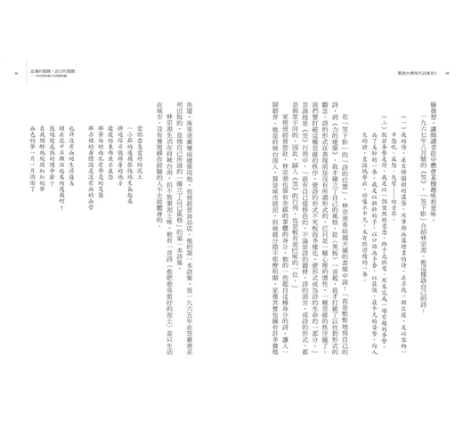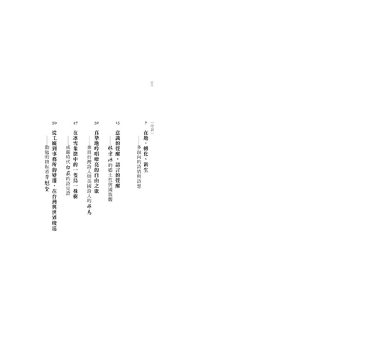 不同於前著中提及的詩人遇到跨海、跨語言的困境,這批一九三○、四○年代詩人面對的是與前行世代不盡相同的政治、文化與社會條件。本土意識成長茁壯,在一次次的論戰與寫作實踐中長養出自身的文學脈絡;詩人們閱讀、譯介西方作品,也為詩壇注入了新的活力。