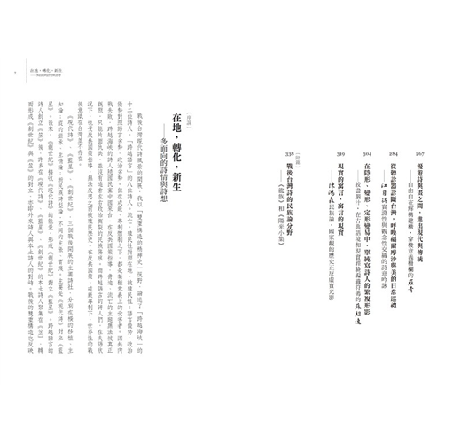 繼雙重構造的精神史,論述二十位一九一○世代到一九二○世代及部分一九三○世代、跨海和跨語詩人後,我以在地、轉化、新生,論述二十位一九三○世代、一九四○世代(其中一位戶籍出生一九五○年,其實,是一九四九年生)詩人,成為我戰後台灣現代詩風景的延續觀照。一九一○世代、一九二○世代詩人,二戰後都是各個國家的主要詩人群,前者戰前已有地位,後者戰後登場。但跨越語言一代的台灣本土詩人,除特殊例子如吳瀛濤、林亨泰、錦連,