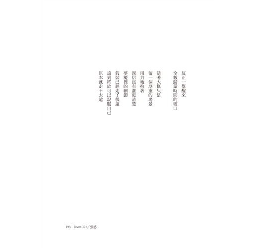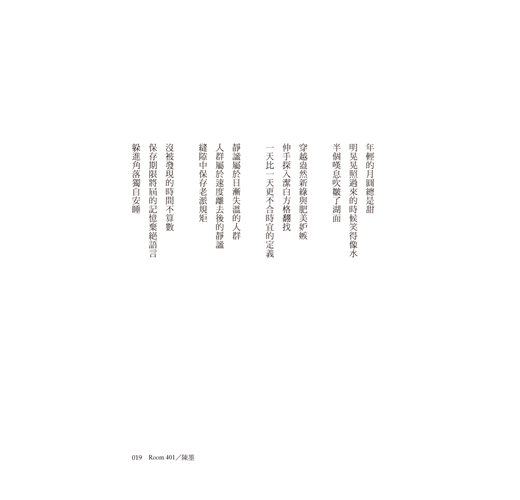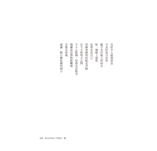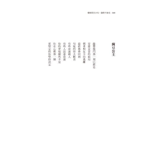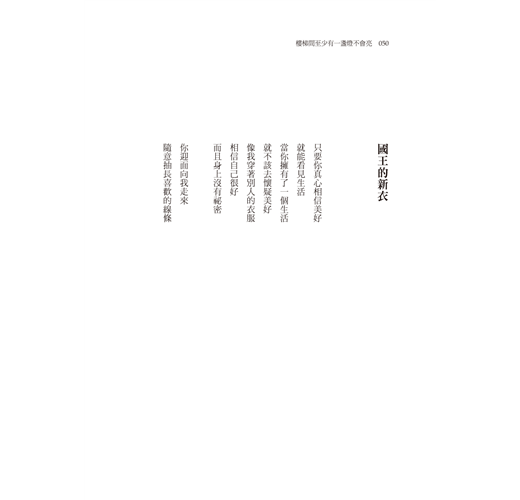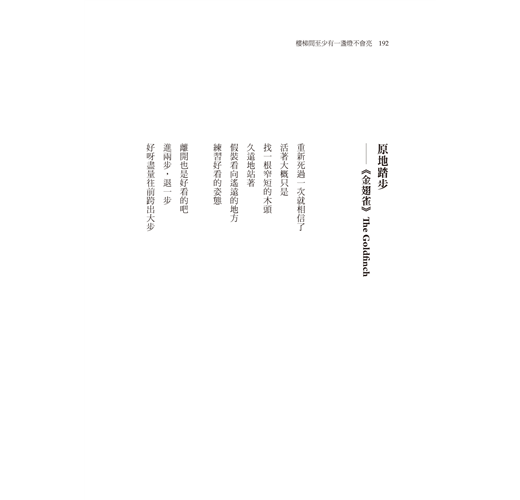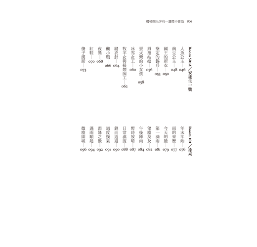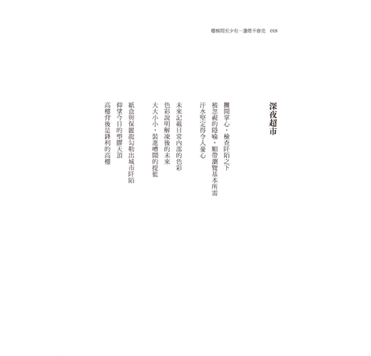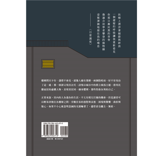樓梯間至少有一盞燈不會亮,就像人總有那麼一兩個陰暗面,好不容易治了這一處,那一頭卻又現出旮旯。詩集以城市中的舊公寓為主題,借用比鄰而居的虛構人物,表現寄居同一個身體裡,那些性格各異的自己。
