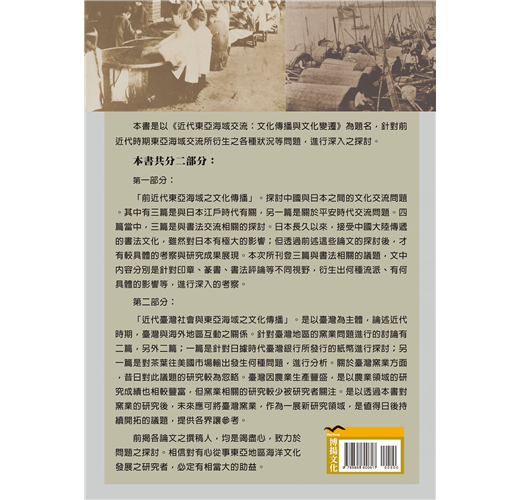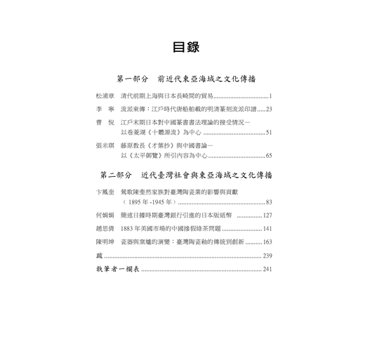 第二部分:「近代臺灣社會與東亞海域之文化傳播」。是以臺灣為主體,論述近代時期,臺灣與海外地區互動之關係。