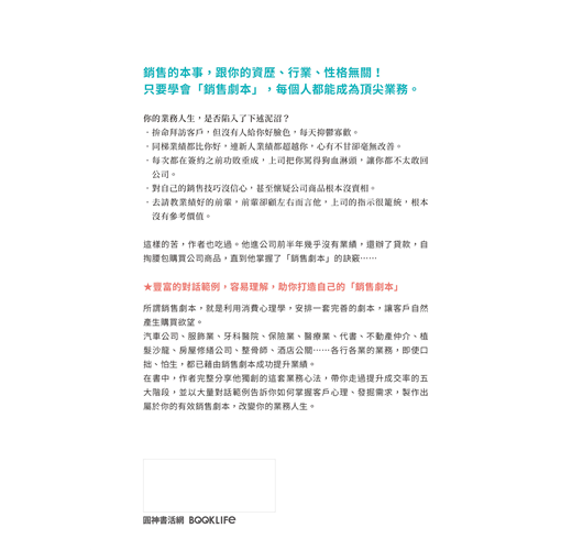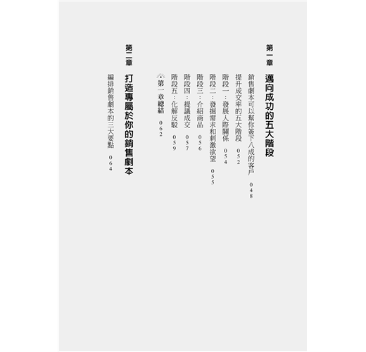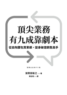 你還在憑感覺跑業務或自掏腰包買業績嗎?日本各大媒體爭相報導的「銷售劇本」心法,教人從便宜的飲料到造價數十億的太陽能電廠都能賣,持續打造出「怪物級業務」,連23歲的金髮打工族,都能變身月績效過億的銷售高手!所謂銷售劇本,就是利用消費心理學,安排一套完善的劇本,讓客戶自然產生購買欲望。汽車公司、服飾業、牙科醫院、保險業、醫療業、代書、不動產仲介、植髮沙龍、房屋修繕公司、整骨師、酒店公關……各行各業的業務,即使口拙、怕生,都已藉由銷售劇本成功提升業績。在書中,作者完整分享他獨創的這套業務心法,帶你走過提升成交率的五大階段,並以大量對話範例告訴你如何掌握客戶心理、發掘需求,製作出屬於你的有效銷售劇本,改變你的業務人生。