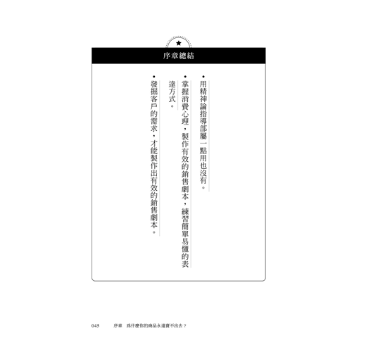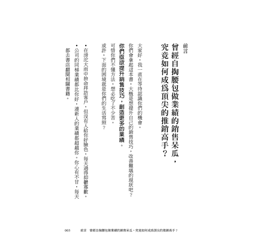 ◎作者為日本百萬銷售學院經營者,被喻為「怪物銷售員製造工廠」,幫助不善交際的銷售員,提升五倍的業績;酒店小姐上完他的課,每月收入也超過三百萬元。