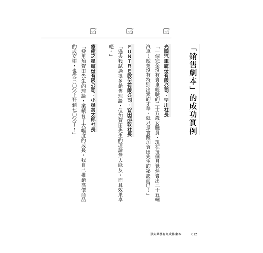 「一個完全沒有賣車經驗的二十五歲女職員,現在每個月竟然賣出二十五輛汽車!她並沒有特別出眾的才華,就只是實踐加賀田先生的祕訣而已!」