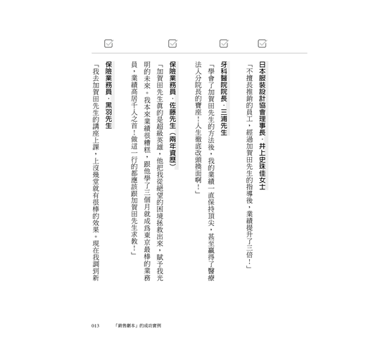 「加賀田先生的理論考慮到客戶的心態,這一點非常重要。多虧學了這套方法,我的成交率提升了兩倍以上,也不用再強迫推銷了。」