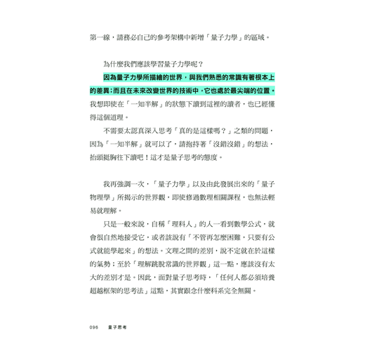 正如同量子力學與量子電腦。儘管目前仍是常識難以理解的存在,但量子電腦的開發和競爭早就在各國熱烈展開,也勢必成為下一個世代的科技主流。人類也一樣,未來將面臨的課題與挑戰絕對不同於現在。想繼續站穩腳步、不被時代淘汰,擁有敢於不同「跳脫常識」的量子思考是不可或缺的。