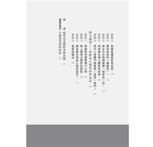 本書由多位日本專科醫生專業審定,帶你了解「腦」、「腸胃」、「肝臟」三大領域的內臟器官積累疲勞問題,一次舒緩大腦、胃腸道和肝臟的深層疲勞。幫助你: