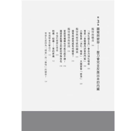 本書會針對「大腦」、「腸胃」、「肝臟」這三個內臟的範疇,列舉出一般人常見的身體不適以及時有所聞的煩惱,作為向各個專科醫師採訪的題材,以尋求解答。例如: