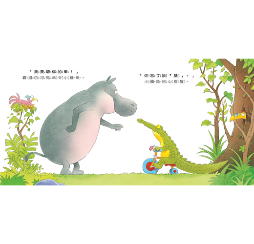 「我要騎你的車!」霸道的河馬命令小鱷魚。