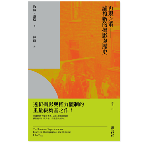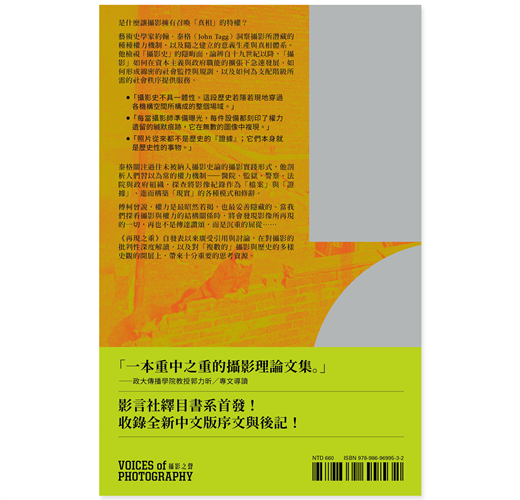 藝術史學家約翰.泰格(John Tagg)洞察攝影所潛藏的種種權力機制,以及隨之建立的意義生產與真相體系。他檢視「攝影史」的隱晦面,論辨自十九世紀以降,「攝影」如何在資本主義與政府職能的擴張下急速發展、如何形成綿密的社會監控與規訓,以及如何為支配階級所需的社會秩序提供服務。