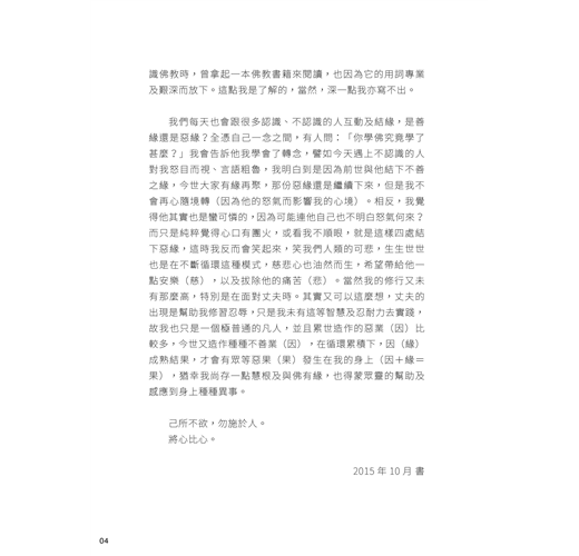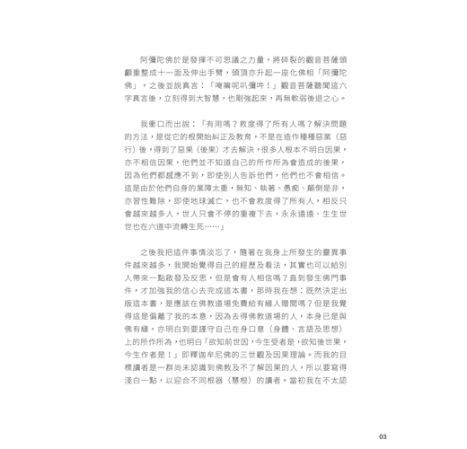 這五、六年來的壓力,主要來自出版這本書,因為我怕被指本書內容鼓吹迷信、妖言惑眾,更擔憂讀者只睇鬼神及拜懺部分,便跟隨我走過的路而出問題。畢竟我過往的歷練跟別人有點不一樣,我能夠以平淡、冷靜面對任何境況,但不代表別人也可以。因此懇請讀者也閱讀「世間覺」系列另外四本書籍《宗教及人生(上)》、《宗教及人生(下)》、《身心靈》和《佛教脈絡》,對世間有多一點的認知,不要做一個一知半解、糊糊塗塗、人云亦云的人。
