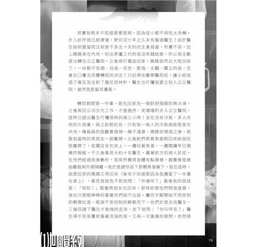 其實我根本不知道甚麼是病,因為從小都不用吃太多藥,步入診所就已經康復,更何況七年之久未有看過醫生?由於醫生說明要留院注射差不多五十天的抗生素殺菌,所費不菲,加上媽媽身在內地,初出茅廬工作的我沒有錢結賬,所以我主動提出轉往公立醫院。之後再打電話回家,媽媽居然自大陸回來了。一向勢不低頭、自我、任性、堅強、主觀、獨立的我,怎會反口覆舌改變轉院的決定?只記得在離開醫院前,護士給我插了黃豆及注射了盤尼西林針,醫生也叮囑我要立刻入公立醫院,當然我是當耳邊風。