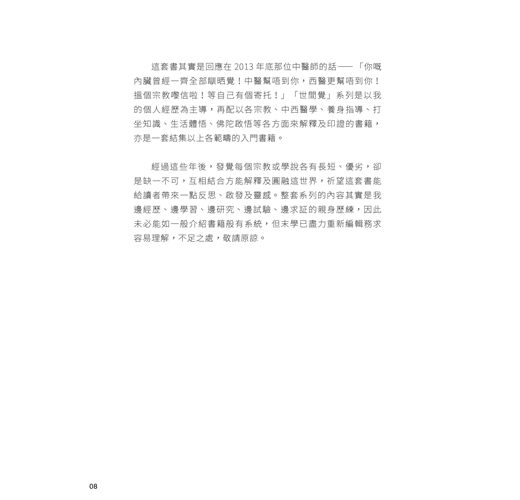 經過這些年後,發覺每個宗教或學說各有長短、優劣,卻是缺一不可,互相結合方能解釋及圓融這世界,祈望這套書能給讀者帶來一點反思、啟發及靈感。整套系列的內容其實是我邊經歷、邊學習、邊研究、邊試驗、邊求証的親身歷練,因此未必能如一般介紹書籍般有系統,但末學已盡力重新編輯務求容易理解,不足之處,敬請原諒。
