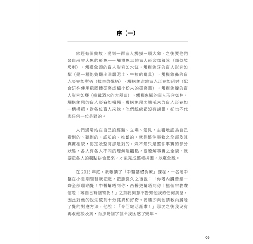 佛經有個典故,提到一群盲人觸摸一頭大象,之後要他們各自形容大象的形象—觸摸象耳的盲人形容如簸箕(類似垃圾剷),觸摸象頭的盲人形容如水缸,觸摸象牙的盲人形容如犁(是一種能夠翻出深層泥土、牛拉的農具),觸摸象鼻的盲人形容如犁柄(拉車的棍柄),觸摸象背的盲人形容如研缽(配合研杵使用把固體研磨成細小粉末的研磨器),觸摸象腹的盲人形容如甕(盛載酒水的大器皿),觸摸象腳的盲人形容如柱,觸摸象尾的盲人形容如粗繩,觸摸象尾末端毛束的盲人形容如一柄掃把。對各位盲人來說,他們統統都沒有說錯,卻也不代表任何一位...