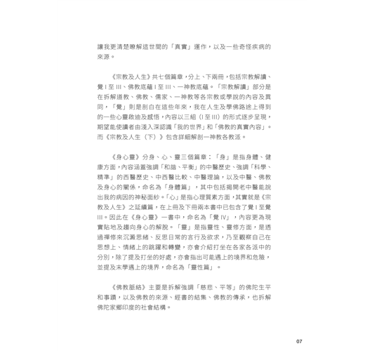 《身心靈》分身、心、靈三個篇章:「身」是指身體、健康方面,內容涵蓋強調「和諧、平衡」的中醫歷史、強調「科學、精準」的西醫歷史、中西醫比較、中醫理論,以及中醫、佛教及身心的關係,命名為「身體篇」,其中包括揭開老中醫能說出我的病因的神秘面紗。「心」是指心理質素方面,其實就是《宗教及人生》之延續篇,在上冊及下冊兩本書中已包含了覺I至覺III。因此在《身心靈》一書中,命名為「覺IV」,內容更為現實貼地及趨向身心的解脫。「靈」是指靈性、靈修方面,是透過禪修來沉澱思緒、反思日常的言行及欲求,乃至觀察自己在思想上、情緒上的跳躍和轉變,亦會介紹打坐在各家各派中的分別,除了提及打坐的好處,亦會指出可能遇上的境界和危險,並提及末學遇上的境界,命名為「靈性篇」。