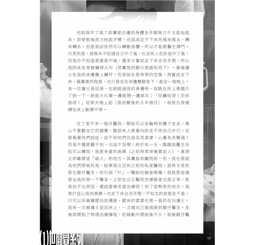轉院期間第一件事,是先回家洗一個舒舒服服的熱水澡,之後再回公司交代工作,才施施然、笑嘻嘻的步入公立醫院,這時已超出醫生叮囑限時的兩三小時!坐在沒有冷氣、多人共用的大房裏,與之前粉紅色、只有我一個人的冷氣病房是差天共地。嘴扁扁的我皺著眉頭一臉不滿意,媽媽安頓我之後,就跟我當時的男朋友一起離開。之後她們再買魚蛋粉回來給我吃就離開了,我獨自坐在床上,一邊咬著魚蛋,一邊閱讀早已預備的報紙。不久後看見大約十名醫生,圍著前方的病人診症,在他們經過我後數秒,我突然覺得身體有點異樣,感覺像是被抽離般與外間隔離。我於是趕快吞下那顆魚蛋躺下,就在這時,說是回家的媽媽又再回來(後來才知道是因為我遺留了一本書在車上),看見我面色不對就問:「你做咩?」最後我的說話是:「唔知!」跟著男朋友也回來,那時即使他們問我甚麼,我也只是眼睜睜的看著他們說不出話,繼而手腳開始不受控制的輕微拉直,眼淚不受控制的簌簌而下。他們於是去找醫生,三催四請下醫生才勉強的走來,坐下就問:「你叫咩名?」醫生得不到答覆就看著流淚的我,又再一次重複的發問,依然得不到答覆,就沒好氣地說:「你再唔答我就走喇!」雖然說不出話,但我的意識仍是清醒及聽覺依然正常,心想如果我可以起身,一定打他兩拳,結果當然是我眼睜睜看著他的背影離去。忽然死亡的感覺籠罩著我,但是我並不害怕,只是問了自己:「有無嘢後悔?」、「有無嘢未做?」在回答自己「無!」後,就失去了意識。