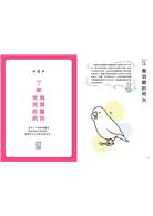 鳥的身體和人類大不同,本書用可愛精確的圖解,幫助飼主了解各種愛鳥的身體訊息。例如:換羽期的注意事項、發情臭的秘密、鳥兒視力特別好的原因、睡覺時還有一半大腦是清醒的……。