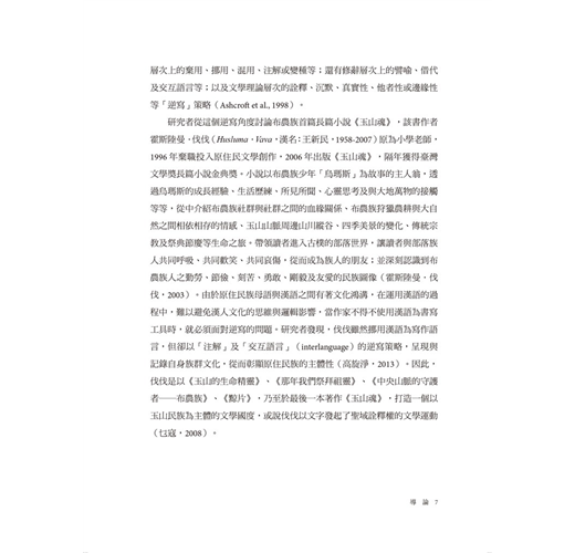 研究者從這個逆寫角度討論布農族首篇長篇小說《玉山魂》,該書作者霍斯陸曼.伐伐(Husluma.Vava,漢名:王新民,1958-2007)原為小學老師,1996 年棄職投入原住民文學創作,2006 年出版《玉山魂》,隔年獲得臺灣文學獎長篇小說金典獎。小說以布農族少年「烏瑪斯」為故事的主人翁,透過烏瑪斯的成長經驗、生活歷練、所見所聞、心靈思考及與大地萬物的接觸等等,從中介紹布農族社群與社群之間的血緣關係、布農族狩獵農耕與大自然之間相依相存的情感、玉山山脈周邊山川縱谷、四季美景的變化、傳統宗教及祭典節慶等生命之旅。帶領讀者進入古樸的部落世界,讓讀者與部落族人共同呼吸、共同歡笑、共同哀傷,從而成為族人的朋友;並深刻認識到布農族人之勤勞、節儉、刻苦、勇敢、剛毅及友愛的民族圖像(霍斯陸曼.伐伐,2003)。由於原住民族母語與漢語之間有著文化鴻溝,在運用漢語的過程中,難以避免漢人文化的思維與邏輯影響,當作家不得不使用漢語為書寫工具時,就必須面對逆寫的問題。研究者發現,伐伐雖然挪用漢語為寫作語言,但卻以「注解」及「交互語言」(interlanguage)的逆寫策略,呈現與記錄自身族群文化,從而彰顯原住民族的主體性(高旋淨,2013)。因此,伐伐是以《玉山的生命精靈》、《那年我們祭拜祖靈》、《中央山脈的守護者─布農族》、《黥片》,乃至於最後一本著作《玉山魂》,打造一個以玉山民族為主體的文學國度,或說伐伐以文字發起了聖域詮釋權的文學運動(乜寇,2008)。