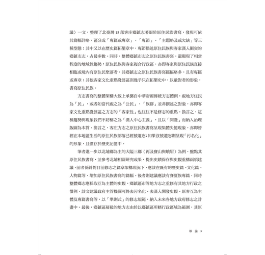 前兩篇文章蒐集既有之鄉鎮市區客庄方志與碑記類地方書寫,作為逆寫之主要討論文本對象。筆者〈北臺灣原客鄉鎮志的原住民族書寫檢討與建議〉一文,整理了北臺灣15部客庄鄉鎮志著眼於原住民族書寫,發現可依其篇幅詳略,區分成「專篇或專章」、「專節」、「主題略及或欠缺」等三種型態;其中又以在歷史篇拓墾章中,專節描述原住民族與客家漢人衝突的鄉鎮市志,占最多數。同時,整體鄉鎮市志之原住民族書寫,還顯現了相當程度的地域性趨勢:原住民族與客家複合行政區,亦即客家與原住民族直接相臨或境內有原住民聚落者,其鄉鎮志之原住民族書寫篇幅略多,且有專篇或專章;其他客家文化重點發展區則幾乎只在拓墾史中,以敵對者的形象,書寫原住民族。