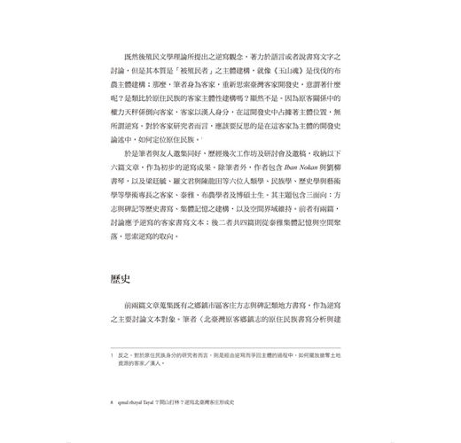 既然後殖民文學理論所提出之逆寫觀念,著力於語言或者說書寫文字之討論,但是其本質是「被殖民者」之主體建構,就像《玉山魂》是伐伐的布農主體建構;那麼,筆者身為客家,重新思索臺灣客家開發史,意謂著什麼呢?是類比於原住民族的客家主體性建構嗎?顯然不是。因為原客關係中的權力天秤係倒向客家,客家以漢人身分,在這開發史中占據著主體位置,無所謂逆寫。對於客家研究者而言,應該要反思的是在這客家為主體的開發史論述中,如何定位原住民族。(註1)