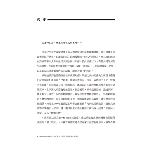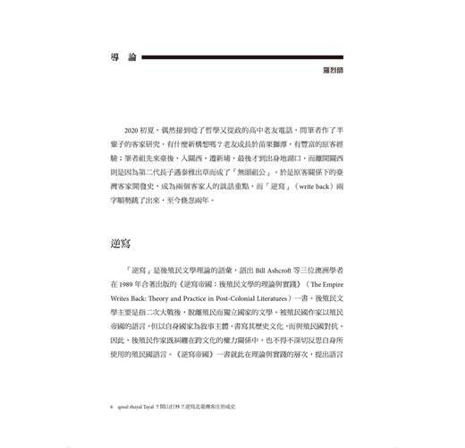 2020 初夏,偶然接到唸了哲學又從政的高中老友電話,問筆者作了半輩子的客家研究,有什麼新構想嗎?老友成長於苗栗獅潭,有豐富的原客經驗;筆者祖先來臺後,入關西,遷新埔,最後才到出身地湖口,而離開關西則是因為第二代長子遇泰雅出草而成了「無頭祖公」。於是原客關係下的臺灣客家開發史,成為兩個客家人的談話重點,而「逆寫」(write back)兩字順勢跳了出來,至今倏忽兩年。