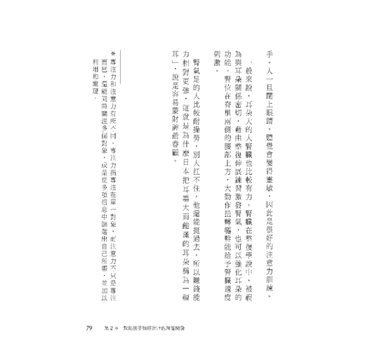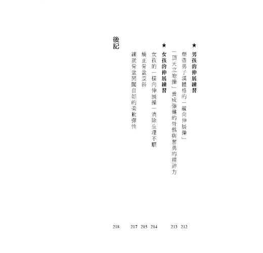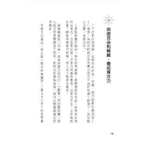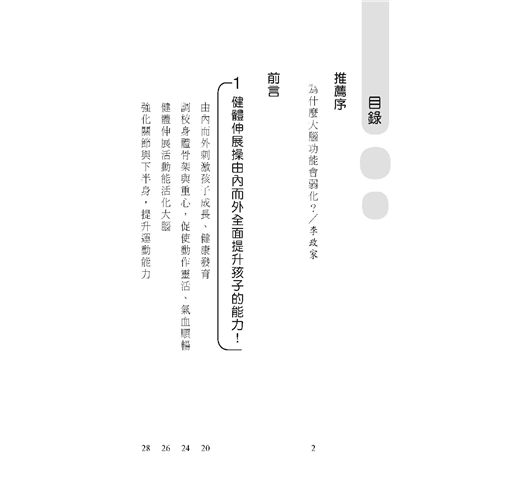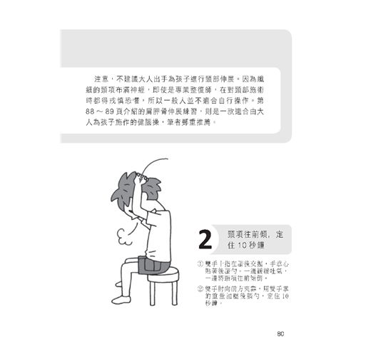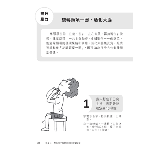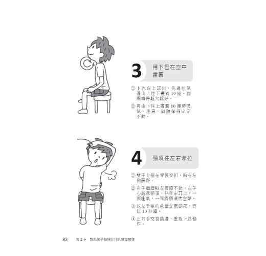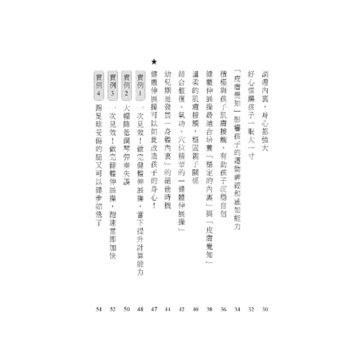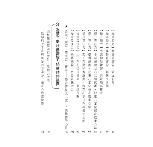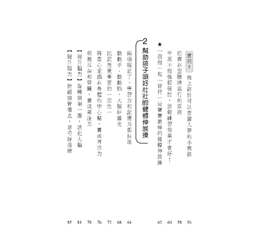 除上述種種外,書中的體操還可以幫助兒童調整姿勢不良和習慣所造成的肌肉僵硬或是骨骼錯位。同時,也可以矯正孩子易怒的個性、視力惡化、注意力不集中和喜歡賴床等棘手的問題。