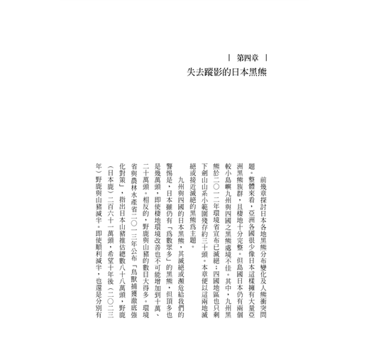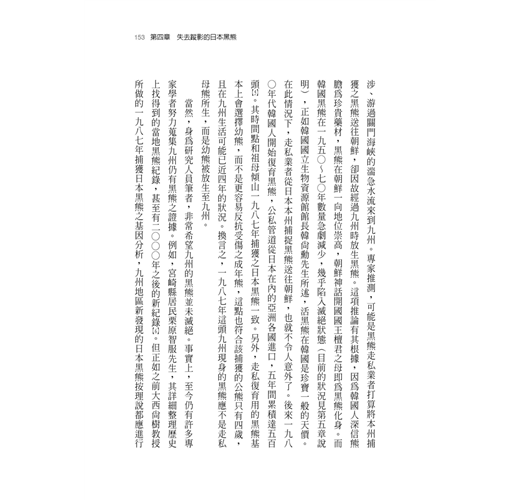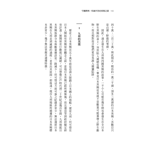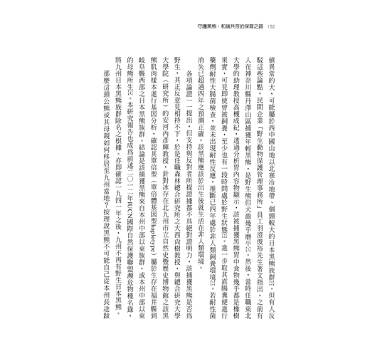 台灣黑熊現況也是筆者一直非常關心的,和日本同為島國的台灣,其國土面積三萬六千平方公里,與九州相當。而如本書所述,九州黑熊早在一九四〇年已經滅絕,其滅絕原因除了山地規模不大之外,主要還是數百年來森林高強度利用(如燒墾、將原始林改造成人工針葉林甚至是草地,以及大量採薪燒炭與砍伐作為礦坑支撐材等),棲地減少遭遇人類機會變多、黑熊「被捕獲壓力」不斷升高。