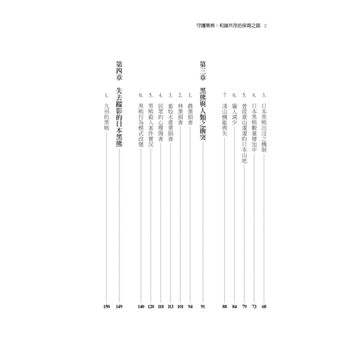 本書於二〇一七年由東京大學出版,內容包括說明日本民眾和黑熊的生存衝突,推估未來還會更加嚴重。這些年來日本人熊衝突案件持續增加,威脅民眾安全而被射殺的黑熊於二〇一九年來到五千二百八十三頭,二〇二〇年更進一步增加為六千〇八十五頭。在此同時,被野生黑熊攻擊的民眾在二〇一九年為一百五十二人,二〇二〇年增為一百五十六人,而且其中有幾人因而致死。目前日本中央與地方政府的黑熊管理對策,基本原則是成立跨區域保育管理單位,實施分區管理。其中特別引人注目、也是本書所指出的,日本政府部門傾向劃定更明確的「黑熊行動紅線」(如跨越紅線之黑熊一律射殺),而且劃設「紅線」的地區與面積越來越大。