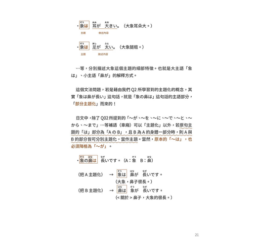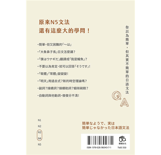 本書『你以為簡單,但其實不簡單的日語文法Q&A』當中的所有問題,都是N5程度的文法問題。雖然說是N5程度的問題,但其實這些問題都很有深度,並非簡單的一、兩句話即可帶過的。例如:「〜は」要怎麼用?這的確是N5就會出現的問題。但這個問題也絕非「〜は強調後面,〜が強調前面」這樣單純一句話就可以道盡。此外,像是:「敬體與常體怎麼分?」這也絕非「敬體用在禮貌對話時,常體用在朋友間對話」這樣短短一句話就可說明一切。