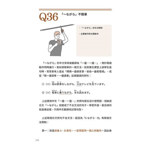 本書就是蒐集了這樣看似簡單,但實際上沒那麼單純的N5文法,並以Q&A的方式呈現,因而取名『你以為簡單,但其實不簡單』!「本篇」總共有60個文法Q&A,「附錄」部分則是整理了「〜が」、「〜を」、「〜に」、「〜で」、「〜は」這五個擁有很多不同用法的助詞。雖然說這些Q&A篇篇獨立,但其實前後皆有緊密關聯,而且前面的篇章比較簡單,後面的篇章比較困難,建議讀者從頭開始閱讀,較為順暢。