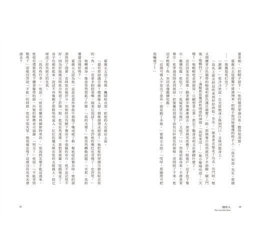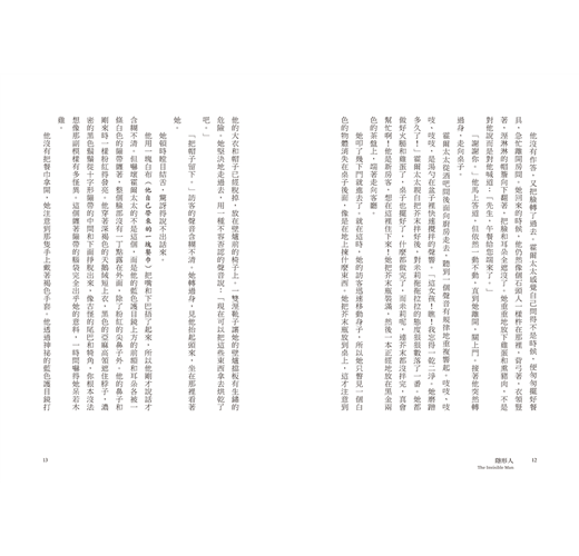「我馬上就去把這些東西好好烘乾,先生。」她拿著衣服走了出去。出門時,她又朝纏著白色繃帶的腦袋和藍色護目鏡瞥了一眼,那條餐巾依然遮住下半張臉。關上門後,她顫抖了一下,滿臉都是驚訝和困惑的神情。「我從來沒——」她小聲嘀咕道,「天哪!」她輕輕地走到廚房,只顧想著心事,都忘了數落米莉又在磨蹭什麼了。