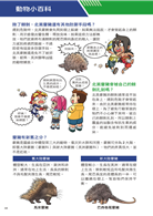 設有「動物小百科」單元,特別介紹鴟鴞科動物和美洲豪豬科動物的構造與小常識,以及叫聲很特別的白領林鴞、擁有心型臉蛋的草鴞、85%的時間都待在樹上的巴西卷尾豪豬、會將食物分散藏在不同地方的中美毛臀刺鼠、會吃自己的糞便以獲得營養素的水豚、看起來永遠都睡不飽的山絨鼠等動物的超炫常識,讓小朋友有系統的學習。