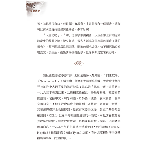 達琳.哲奇從創作「向主歡呼」詩歌的經歷談起,見證神如何將生命的氣息吹進這顆夢想種子,當她將專一的熱情、屬天的恩賜全然獻上時,神就向她賜下恩寵來實現這個夢想。這個屬天的交換舉動,就是「天堂之吻」。