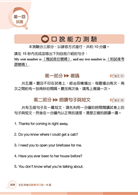 2. 關於初級口說的考試題型,其中許多部分的出題類型皆有其規律存在,我在本書當中的命題方式,可以說是完全掌握了正式考試的出題類型,讓大家把時間花在刀口上,協助各位考生迅速抓住應試要點。本書的另外一個特色是,相較於許多其他書籍都把回答寫得太長(有些甚至都超過中級的回答標準),其實這個大題的考試重點在於「切題」和「流暢」,因此本書的參考答案提供了很好的回答範例,並且都是由外籍老師真實地回答(外師事先並不知道題目)。同時,也要請各位老師和同學們多多注意「回答自然」(appropriate register) 這一部分,因為這對於加分是大有助益的。